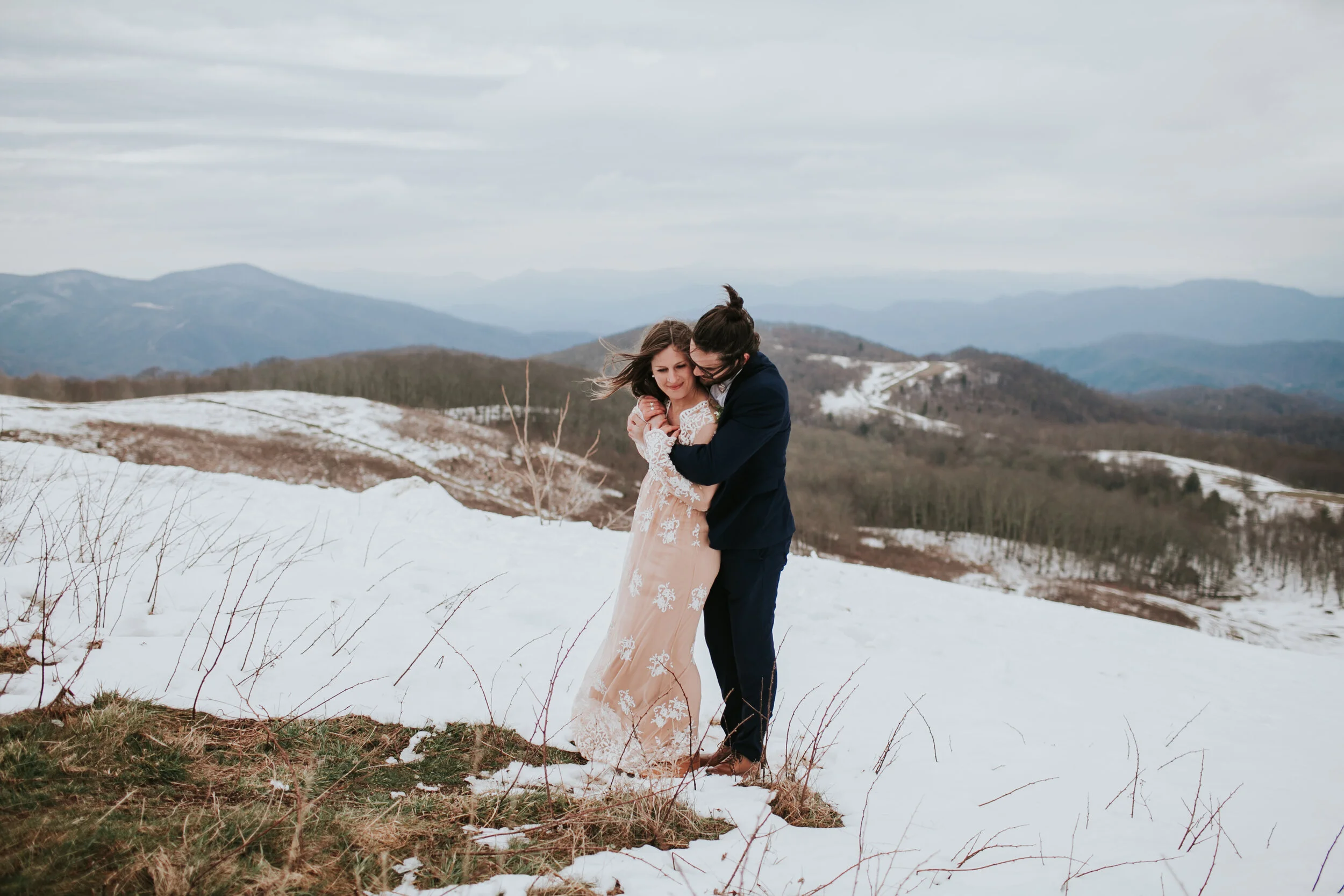 Many popular hiking spots, like the Blue Ridge Parkway, are closed during the winter months due to snowfall. (If you are specifically thinking of the Blue Ridge Parkway make sure to check this website for road closures!) But you can still have a beautiful outdoor ceremony with stunning views! Ask your photographer to suggest elopement locations that are easily accessed on foot, and be open-minded. In general the trails and stunning locations anywhere are a lot less crowded during the winter. If you plan to hike, it’s also important to consider how much longer and more difficult it is to hike in the snow when picking a trail.
